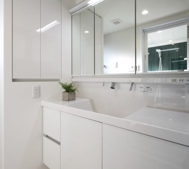 間接照明のやわらかな光が広がる空間が出来上がりました。壁や天井を照らすライン照明が空間の奥行きと広がりを感じさせてくれます。眩しさを抑えて落ち着いた雰囲気を演出。白を基調とした凸凹のある壁の素材を引き立てるように計画しました。間接照明を用いることで「昼」も「夜」も美しい光環境をつくることができました。下駄箱下のライン照明もポイントです。寝室は、グレー色のアクセントクロスで、自然と眠りに導くような落ち着いた雰囲気に。建具は人気の深いグリーン色の建具を使用、家具はウッド素材、ベージュ色のソファで、スタイリッシュさの中にも温かみが感じられるお部屋になりました。